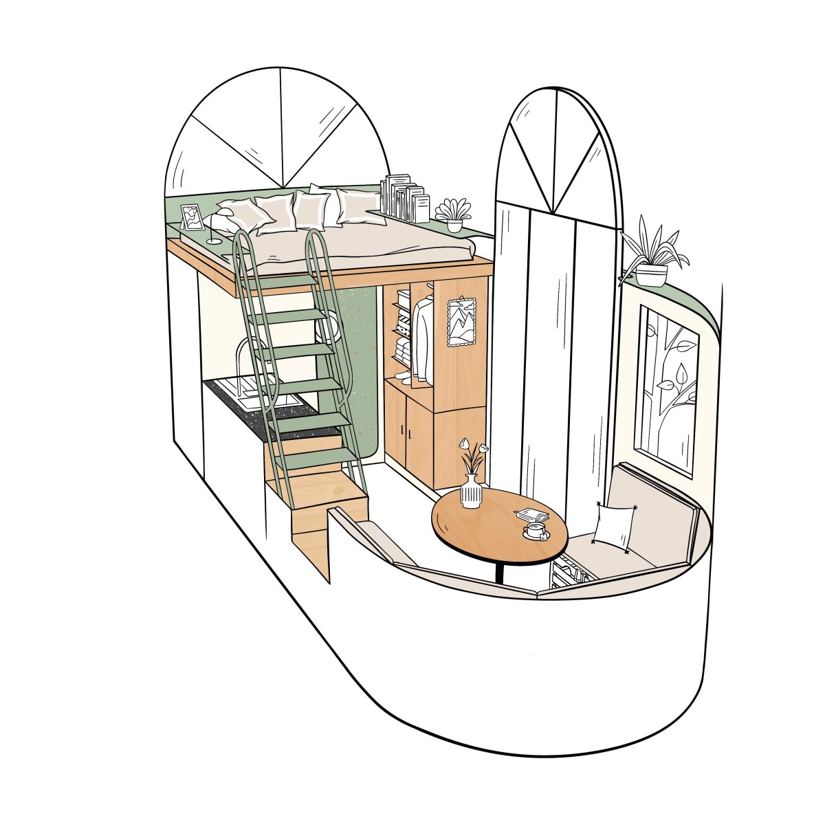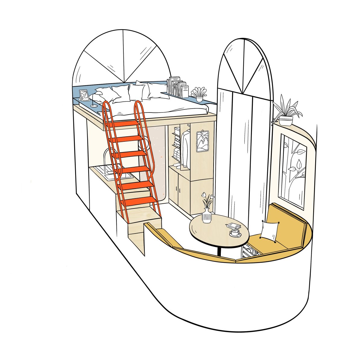 Le modèle emblématique Ricoche. Il marque le début de l’aventure grâce à son salon rond baigné de lumière par trois grandes fenêtres panoramiques.